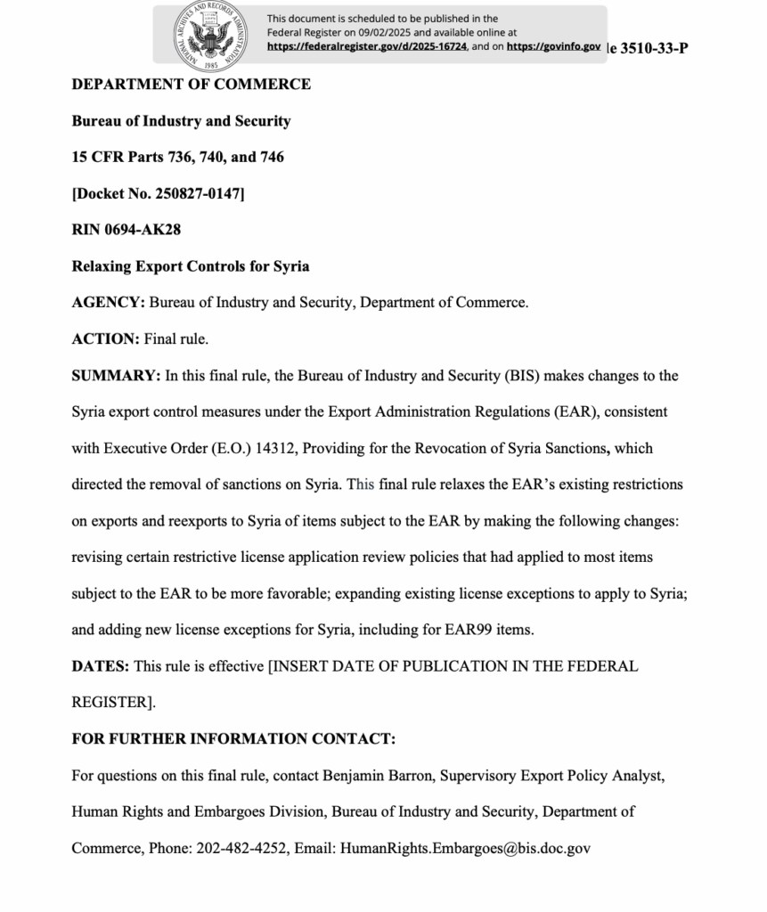 In a final rule scheduled for publication in the Federal Register on September 2, 2025, the U.S. Department of Commerce’s Bureau of Industry and Security (“BIS”) formally implemented sweeping changes to the Export Administration Regulations (“EAR”) as they pertain to the Syrian Arab Republic. The action follows Executive Order 14312, Providing for the Revocation of Syria Sanctions, issued on June 30, 2025, in which the President determined that it was in the national security and foreign policy interests of the United States to revoke long-standing sanctions and restrictive controls on Syria. BIS’s regulatory amendments mark the most significant rollback of Syria-related export restrictions since the Syria Accountability and Lebanese Sovereignty Restoration Act of 2003, and are designed to align the EAR with the Administration’s broader effort to support stabilization and economic reconstruction in Syria.